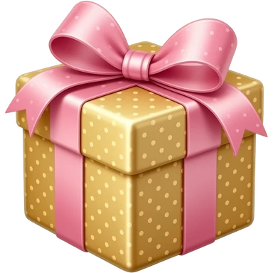 A charming emoji of a small gift box wrapped in champagne gold paper with a shiny pink ribbon bow, surrounded by golden sparkles and light rays, luxurious and glittery, beauty gift aesthetic emoji