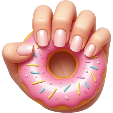 A cute emoji of a feminine hand with glazed donut nails in pearl pink, a highlighter shimmer on the back of the hand, golden sparkle particles floating around the fingers, beauty lifestyle aesthetic emoji