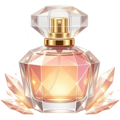 A charming emoji of a small perfume bottle with a faceted crystal-like surface reflecting gold and pink light, sparkles and light prisms around it, ivory and rose gold palette, luxury beauty aesthetic emoji