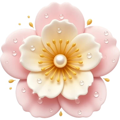 A lovely emoji of a blooming flower with pearl-shimmer petals in soft pink and ivory tones, golden pollen sparkles drifting around, dewy and luminous, spring beauty aesthetic, glowing highlight effect emoji
