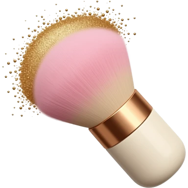 A cute emoji of a fluffy makeup brush with soft pink bristles, gold shimmer powder swirling around the tip, sparkles floating in the air, ivory handle with rose gold details, beauty and cosmetics aesthetic emoji