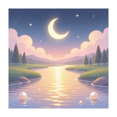 A dreamy emoji of a moonlit river with soft gold and pearl shimmer rippling on the water surface, crescent moon above, ivory and blush pink tones, ethereal and glowing, beauty brand inspired emoji
