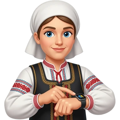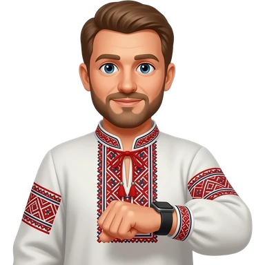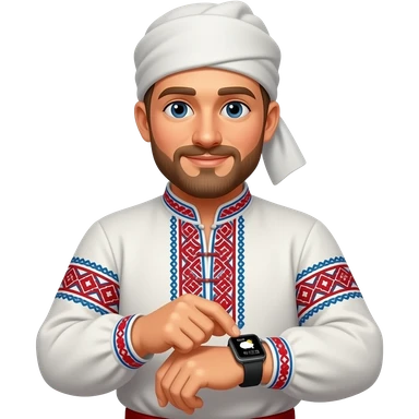 a russian peasant in national suit looking to apple watch wearing on hand for weather forecast emoji
