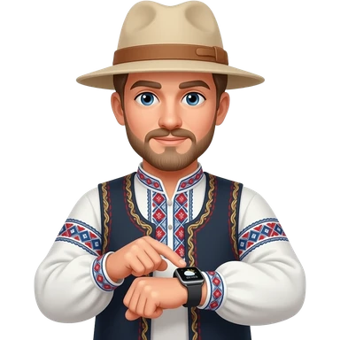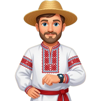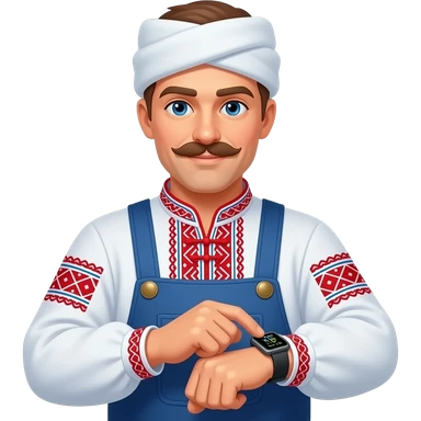 a russian peasant with hat in national suit looking to apple watch wearing on hand for weather forecast emoji