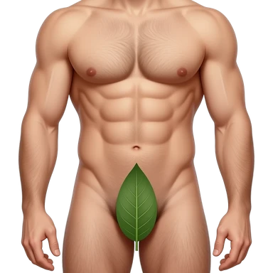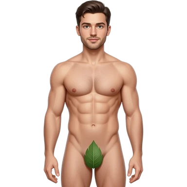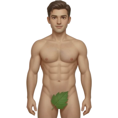 A guy about 23 years old, handsome, full-length, completely naked, has six-pack abs, his genitals are covered by a leaf , He has natural body hair on his arms, legs, and a faint line of hair below his navel. emoji