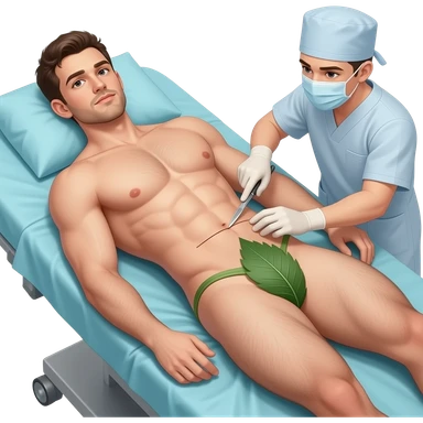 A guy about 23 years old, handsome, full-length, completely naked, has six-pack abs, his genitals are covered by a leaf , He has natural body hair on his arms, legs, and a faint line of hair below his navel. He lies in operating table . The surgeon uses a scalpel to make a cut in guy stomach. emoji