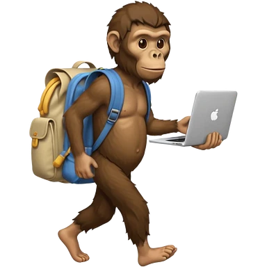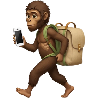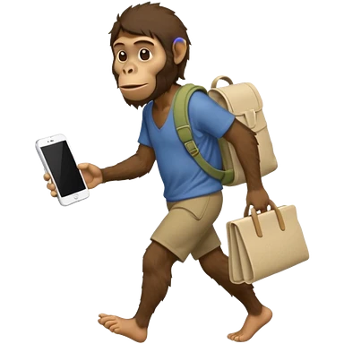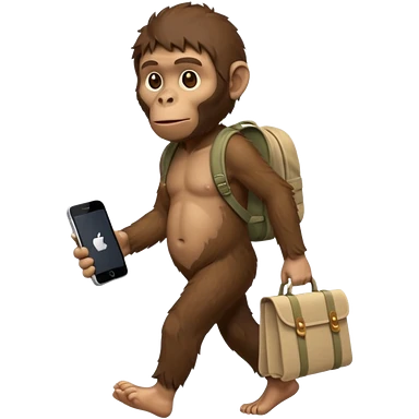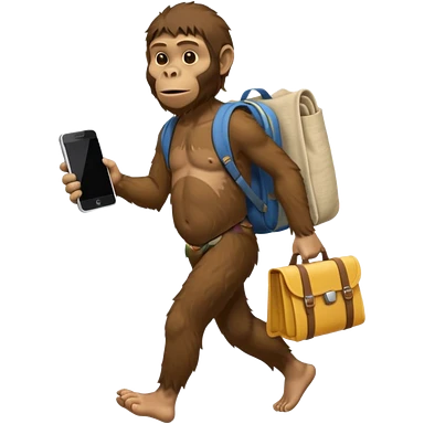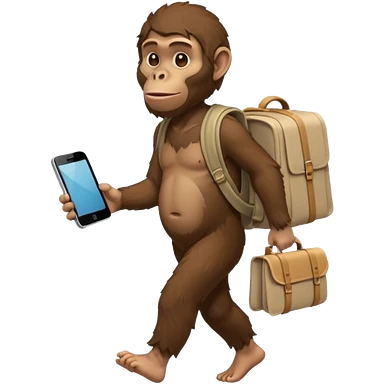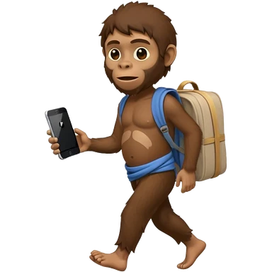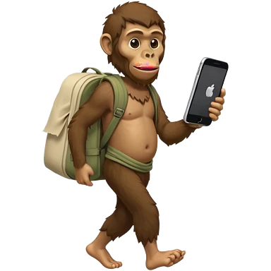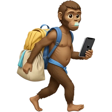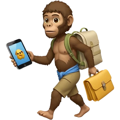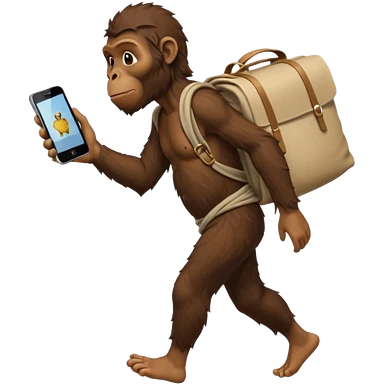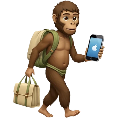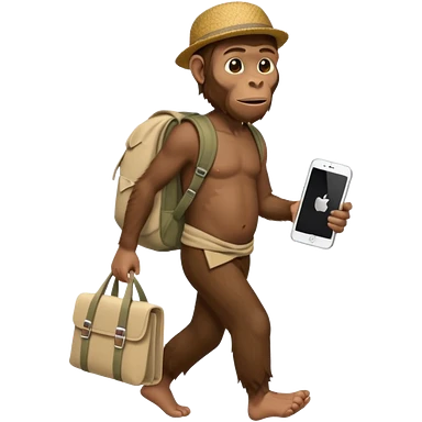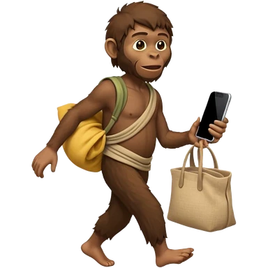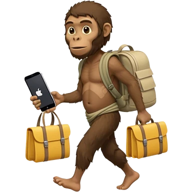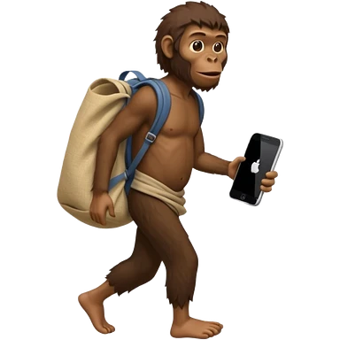 Draw an Australopithecus walking like a nomad, carrying a cloth bundle on its back and holding an iPhone in one hand and an macbook(screen visible) in the other, in a cute flat iPhone emoji style emoji
