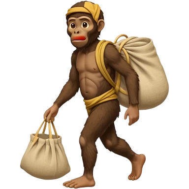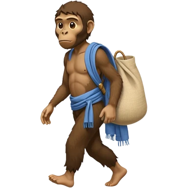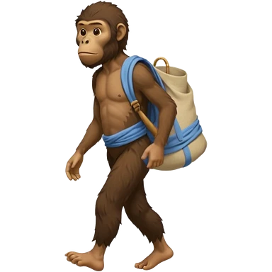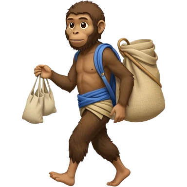 Draw an Australopithecus walking like a nomad, carrying a cloth bundle over its shoulder, in a cute flat iPhone emoji style emoji