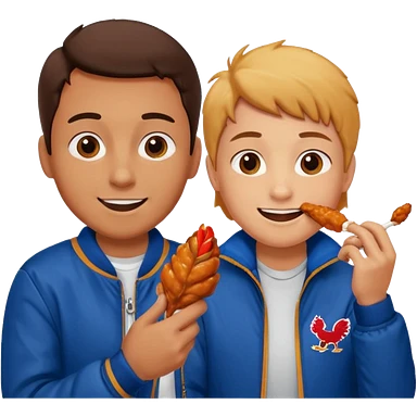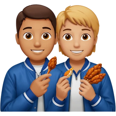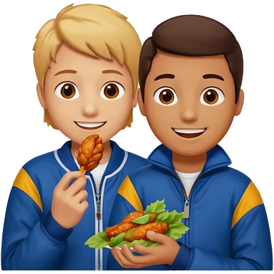 Human eating a chicken wing while watching hockey wearing a jacket with his friend smiling beside him. emoji