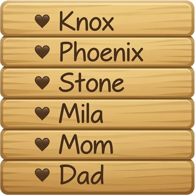 A wood sign that has a list that says Knox phoenix stone mila mom and dad with hearts on it emoji