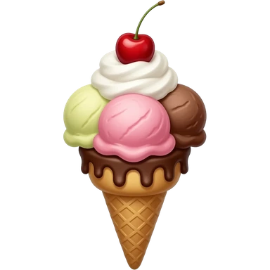 Triple scoop ice cream with a chocolate cone with whipped cream and a cherry on top emoji