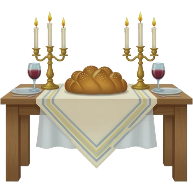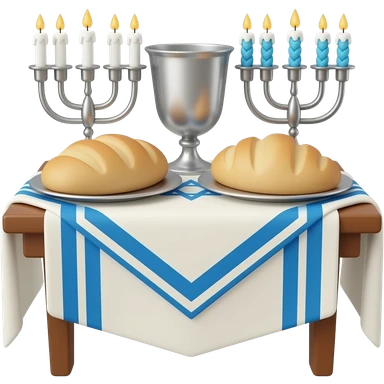3D emoji of Shabbat table: two Challah breads under cloth, silver Kiddush cup, lit candlesticks, braided Havdalah candle, silver spice box. Mezuzah background. Glossy, vibrant, isometric UI asset, 8k. emoji
