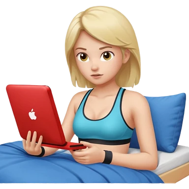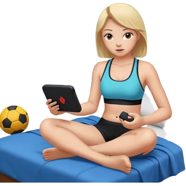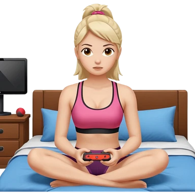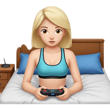 a naked girl sitting on her bed, in a sports bra, playing a video game emoji