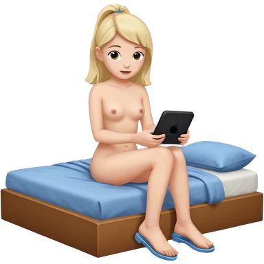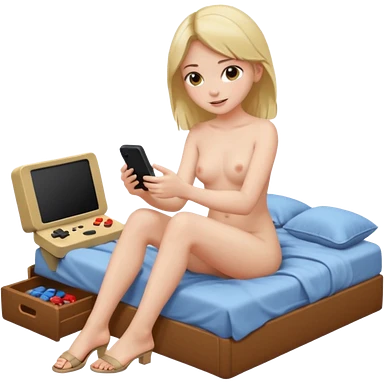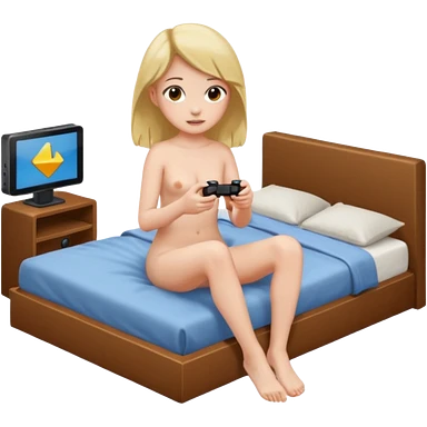 a girl, naked, sitting on her bed, playing a video game emoji