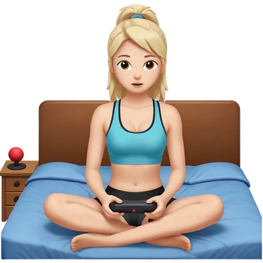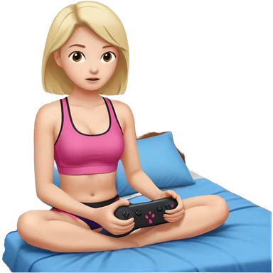 a girl in no pants sitting on her bed, in a sports bra, playing a video game emoji