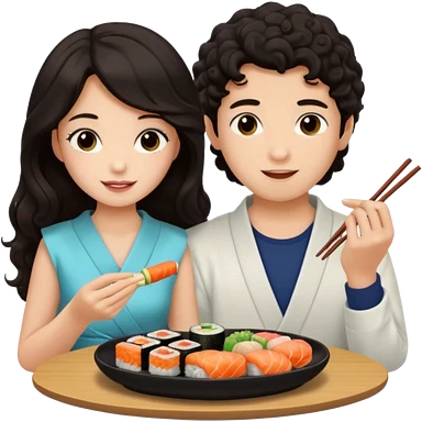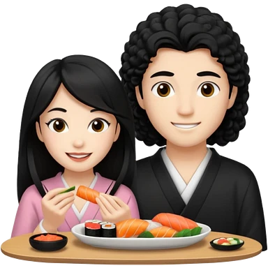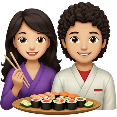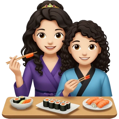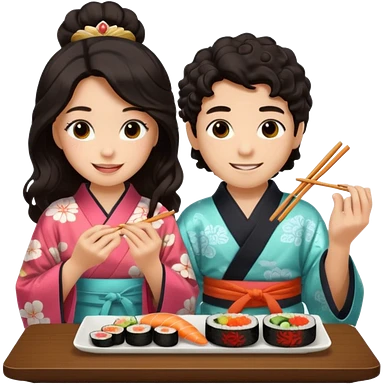 czarnowłosa ksieżniczka w dlugich wlosach je sushi z chłopakiem o czarno brązowych kręconych włosach i są zadowoleni i są nastolatkami i te włosy są lekko krecone emoji