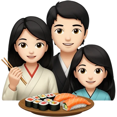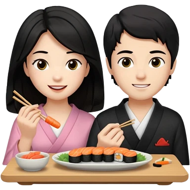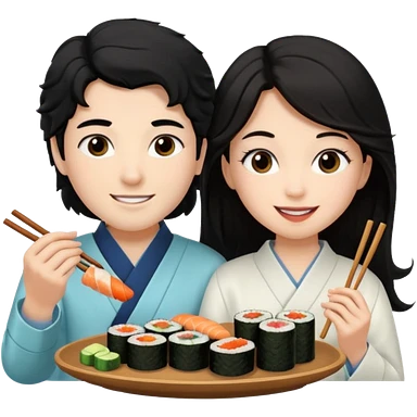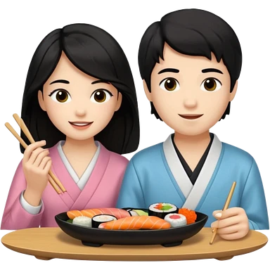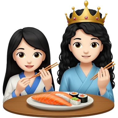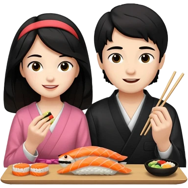 czarnowłosa ksieżniczka w dlugich wlosach je sushi z chłopakiem o czarno brązowych włosach i są zadowoleni i są nastolatkami i te włosy są lekko krecone i chłopak ma włosy do wysokosi nad brwiami emoji