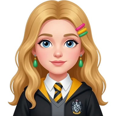 Luna Lovegood emoji, Apple style, clean 3D, soft gradients, teenage girl age 15–16, long blonde hair, dreamy expression, quirky colored accessories (pink, yellow, blue, green), Ravenclaw accents like yellow plus black color, minimal icon, centered, white background, high detail emoji