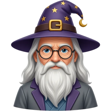 Albus Dumbledore emoji, Apple style, clean 3D, soft gradients, elderly man, long silver beard, half-moon glasses, wizard hat, calm expression, minimal icon, centered, white background, high detail emoji