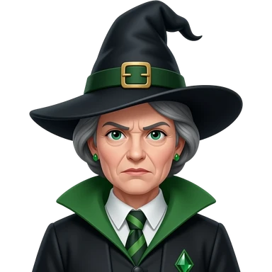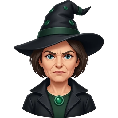 Minerva McGonagall emoji, Apple style, clean 3D, soft gradients, older woman, stern expression, dark hair in bun, pointed hat, emerald accents, minimal icon, centered, white background, high detail emoji