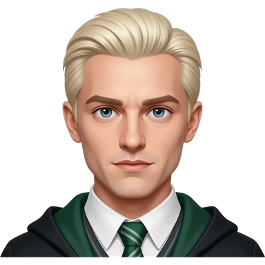 Draco Malfoy emoji, Apple style, clean 3D, soft gradients, pale blond slicked-back hair, sharp features, Slytherin green accents, minimal icon, centered, white background, high detail emoji