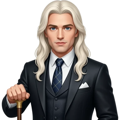 Lucius Malfoy emoji, Apple style, clean 3D, soft gradients, adult man, long platinum blond hair, aristocratic features, cane, cold expression, minimal icon, centered, white background, high detail emoji