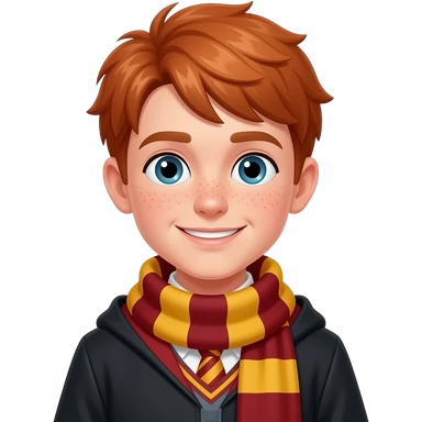 Ron Weasley emoji, Apple style, clean 3D, soft gradients, teenage boy age 15–16, red hair, freckles, friendly expression, Gryffindor accents, minimal icon, centered, white background, high detail emoji