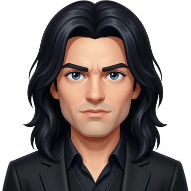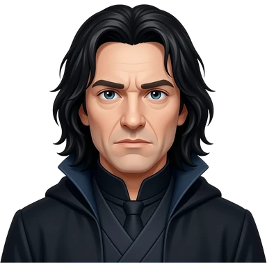 Severus Snape emoji, Apple style, clean 3D, soft gradients, adult man, pale skin, long black hair, hooked nose, dark robes, serious expression, minimal icon, centered, white background, high detail emoji