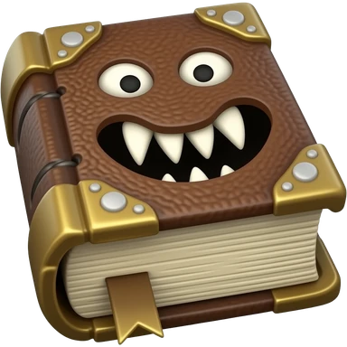 book emoji, small leather-bound spellbook with stitched spine, jagged sharp teeth along opening pages like jaws, glowing round eyes on cover, slightly worn cover, mischievous aggressive expression, fantasy creature, centered, simple background, high detail, 3D emoji style, soft lighting emoji