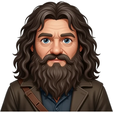 Rubeus Hagrid emoji, Apple style, clean 3D, soft gradients, large bearded man, wild dark hair, kind eyes, rugged clothing, minimal icon, centered, white background, high detail emoji