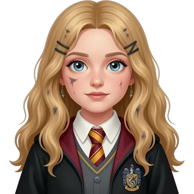 Hermione Granger emoji, Apple style, clean 3D, soft gradients, teenage girl age 15–16, bushy brown hair, expressive eyes, Gryffindor accents, minimal icon, centered, white background, high detail emoji