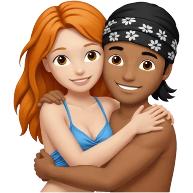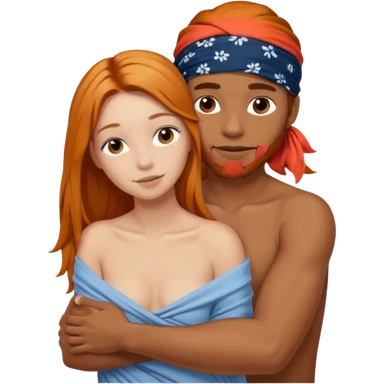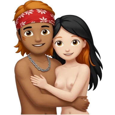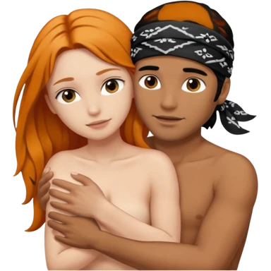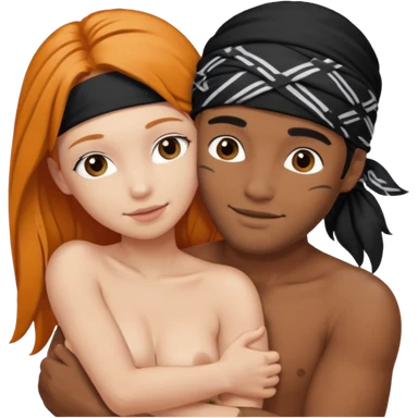 Brown guy with black hair with bandana on his head naked hugging a white girl with long ginger hair naked emoji