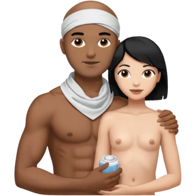 Brown guy shirtles with a bandana no hair holding a naked white girl with black hair emoji