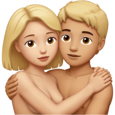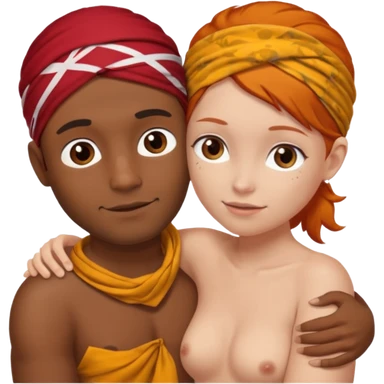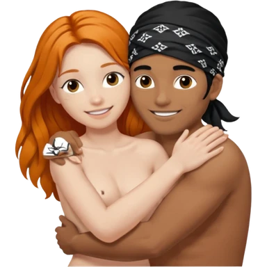 Two people naked hugging, brown man with bandana no hair, white girl ginger hair emoji