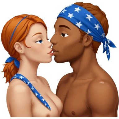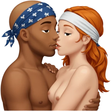 Two people naked kissing, brown man with bandana no hair, white girl ginger hair emoji