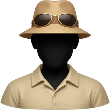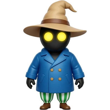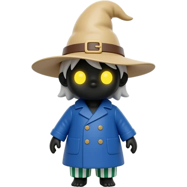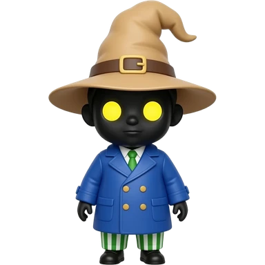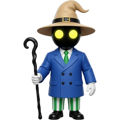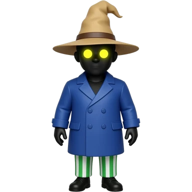 pitch-black face illuminated only by two glowing, circular yellow eyes. He wears a tall, floppy tan wizard’s hat, a bulky blue double-breasted coat, and distinctive green-and-white striped balloon trousers. white gloves and a staff emoji
