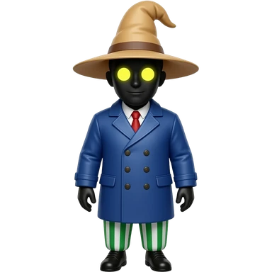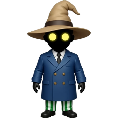 pitch-black face illuminated only by two glowing, circular yellow eyes. He wears a tall, floppy tan wizard’s hat, a bulky blue double-breasted coat, and distinctive green-and-white striped balloon trousers. emoji