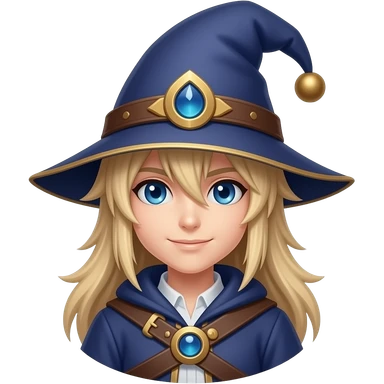 pitch-black face illuminated only by two small glowing, circular yellow eyes. He wears a tall, floppy tan wizard’s hat, a bulky blue double-breasted coat, and distinctive green-and-white striped balloon trousers. white gloves and a staff emoji