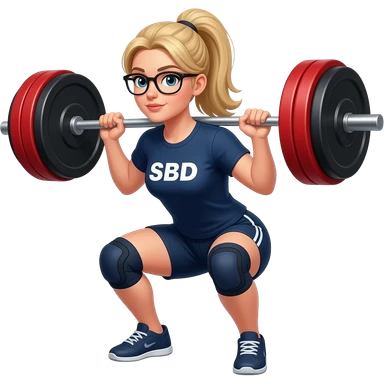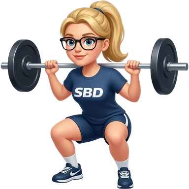 blond long hair female with glasses and pony tale doing squats with a barbell wearing sbd tshirt and shorts emoji