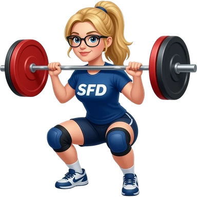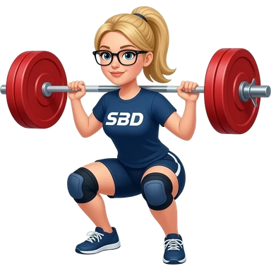 blond long hair female with glasses and pony tale doing squats with a barbell with 2 red and 1 black plates to the left and 2 red and 1 black plate to the right wearing SBD dark blue tshirt and dark blue shorts, knee sleves emoji