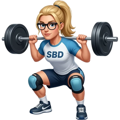 blond long hair female with glasses and pony tale doing squats with a barbell wearing sbd tshirt and shorts, knee sleves emoji