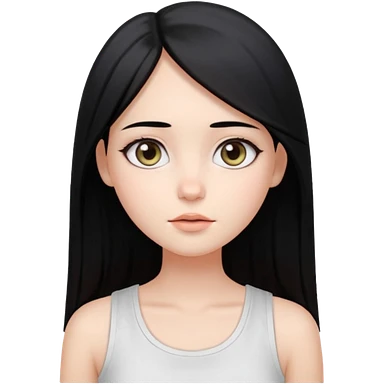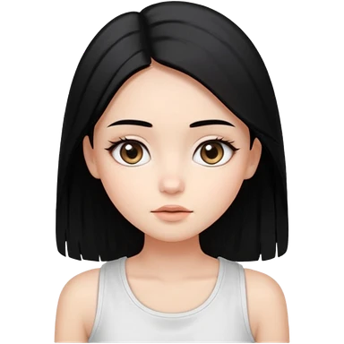 Smooth skin, soft shading, large expressive eyes, natural makeup. Long straight black hair, center part. Minimalistic and cute facial expression. White sleeveless top. Bright studio lighting, plain white background. High resolution, polished, modern, simple aesthetic. emoji