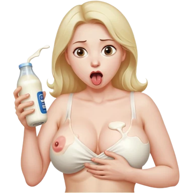 Expression shock, sticks tounge out, Woman with no clothes, she has massive breasts and big nipples, on her right side was a man holding, milk spilled it on her chest. emoji