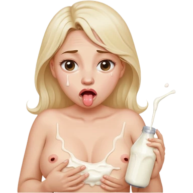 Woman rolls eyes, sticks tounge out with saliva, she cries, has spilled milk on her chest, she was lactating, Bare skin Woman with ver large massive tits and nipples emoji