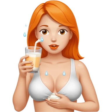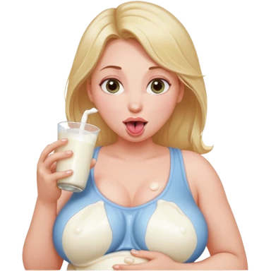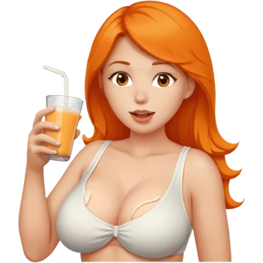 Bare skin woman, with very large breast and big nipples, she sticks her orange out with saliva, she was holding glass of milk, milk spilled on her chest emoji