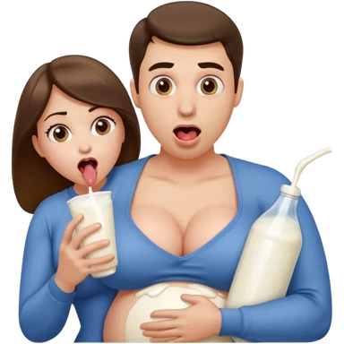 Expression shock, sticks tounge out, Woman with no clothes, she has massive breasts and big nipples, on her right side was a man holding, milk spilled it on her chest only, left nipple dripping with milk emoji