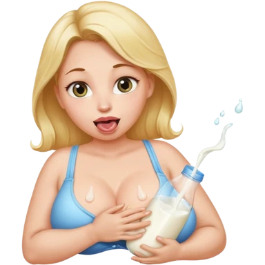 Crying water, Expression shock, sticks tounge out, Woman with no clothes, she has massive breasts and big nipples, on her right side was a man holding, milk spilled it on her chest only, left nipple dripping with milk emoji