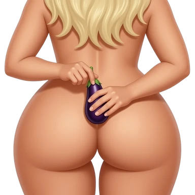 Curvy, big butt, very busty, big breast,light skin,Latina Woman with long blonde hair, she is Naked,NUDE full body exposed, head to toe, she is inserting an upright eggplant in her fully visible Vagina emoji