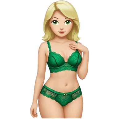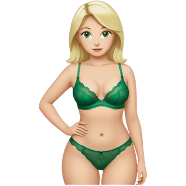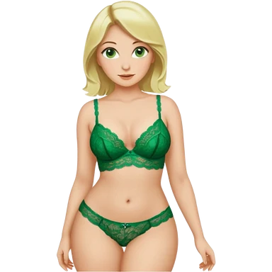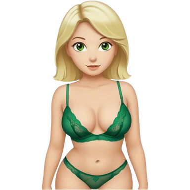 Blonde, green eyed woman with shoulder length hair. She is curvy with a big butt and small breast. She is wearing green lingerie emoji