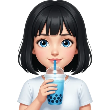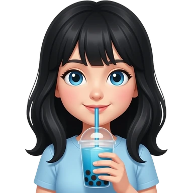 A girl with a black hair and light blue eyes drinking blue buble tea. emoji